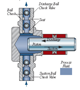 هنگام عمل مکش، حرکت پیستون سبب می شود توپی شیر یکطرفه سمت مکش از روی نشیمن خود حرکت کند و سیال به داخل پمپ وارد شود. در همان موقع توپی شیر یکطرفه سمت رانش بر روی نشیمن خود فشرده می شود و امکان خروج سیال را غیر ممکن می سازد. هنگام کورس رانش، عکس این عمل اتفاق می افتد.