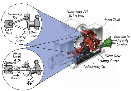 این طرح عملکرد فوق العاده بهتری نسبت به مکانیزم میل لنگ خارج از مرکز دارد. یک چرخدنده مارپیچی دور بالا، دور الکتروموتور را کاهش و به میل لنگ دورانی منتقل می کند (شکل 4-19 و 4-20). یک میله رابط Connecting Rod که در دو سر خود یاتاقانهای کروی دارد از یک طرف به میل لنگ دورانی و از طرف دیگر به مجموعه Cross head و پیستون متصل است. در حالت دبی صفر یا به اصطلاح کورس صفر، محور میل لنگ دورانی و محور چرخدنده مارپیچ بر هم عمود هستند (شکل 4-19). در این حالت حرکت رفت و برگشتی مجموعه Cross head و پیستون تولید نمی شود و فقط میله رابط حول دایره میل لنگ دوران می کند. بسته به انحراف زاویه میل لنگ نسب به محور چرخدنده مارپیچ، کورس رفت و برگشتی شکل می گیرد. برای شکل گیری ماکزیمم کورس رفت و برگشتی، می بایست بیشینه زاویه ممکن بین میل لنگ و محور چرخدنده مارپیچی ایجاد شود. این زاویه نسبت به حالت کورس صفر (زاویه 90 درجه بین میل لنگ و محور چرخدنده مارپیچی) اندازه گیری می شود. صرفنظر از میزان تنظیم طول کورس، این سیستم در انتهای کورس رانش، بیشترین نیرو را به سیال وارد می کند. این امر سبب می شود حداکثر سیال ممکن از گذرگاه سیال تخلیه گردد.