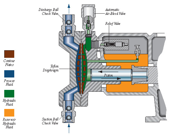 فشار سیال هیدرولیک و فشار سیال فرایند هر دو یکسان است. در نتیجه فشار در دو طرف دیافراگم در تمام زمانها متعادل خواهد بود و سبب حذف تنش در آن می شود. دو صفحه کانتور مسیر حرکت دیافراگم را احاطه می کنند. سیال هیدرولیک و سیال فرایند از سوراخ های صفحه کانتور که به دقت طراحی شده اند عبور می کنند تا در تماس با دیافراگم باشند. شیرهای فشار شکن و پر کننده Refill حجم سیال هیدرولیک را کنترل می کنند. یک شیر تخلیه اتوماتیک هوا Automatic air bleed valve به طور پیوسته هوا را از سیال هیدرولیک خارج می کند.
